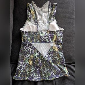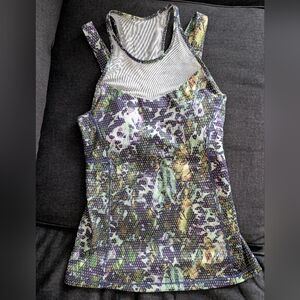 Good used condition. Size 4 Lululemon Running In The City tank top. Floral multi color pattern with mesh inserts. Built in bra.