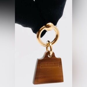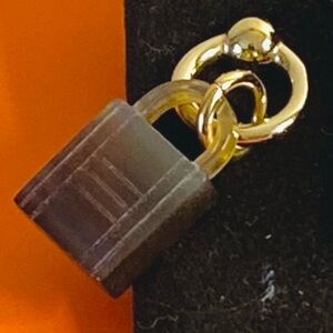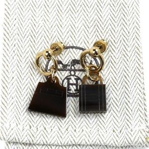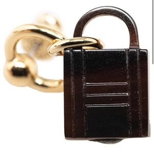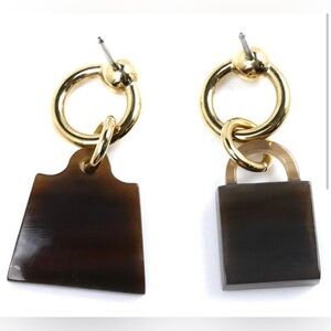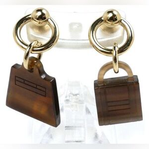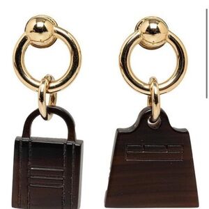 These stunning earrings feature a gold permabrass loop stud, holding a brown buffalo horn Hermes lock on one earring and a signature Kelly bag on the other.