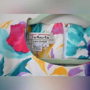 Authentic vintage 1980s Talbots women’s dress in size 8 featuring a bold watercolor floral print in teal, purple, yellow, and pink on a white background.