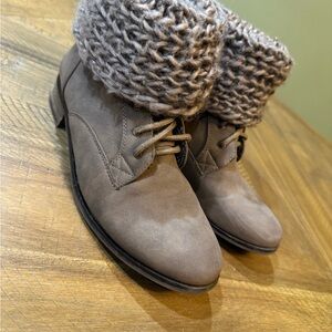 Brown boots with a cozy knit cuff design. Ideal for casual outings. Great condition, view all photos, no crazy signs of wear.