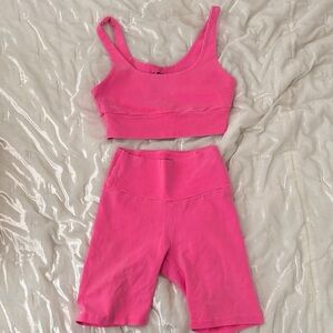 Vibrant sports bra and shorts. Great for workouts! The sports bra is a size S and the shorts are a size XS.