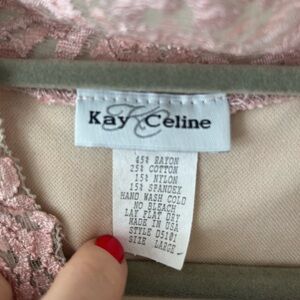 VINTAGE KAY CELINE powder pink lace with nude underlay lining, V-neck , slight mock collar, sleeveless top, stretch giving a flattering look, perfect for any occasion. Features intricate lace detailing for a stylish look.