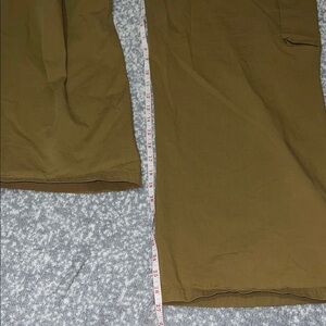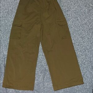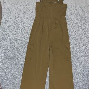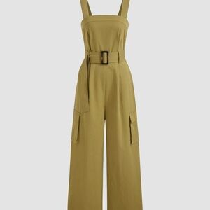 Chic khaki jumpsuit with wide straps. Features a belted waist and cargo pockets. Perfect for versatile styling. 100% Cotton missing Belt in good condition adjustable straps