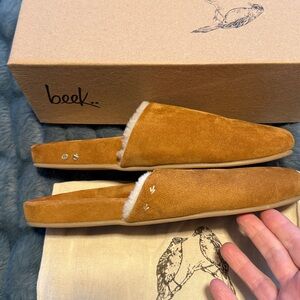 Beautiful Beek mules in a lovely caramel color. Gently used, minor scuff on toe of right shoe. No stains.