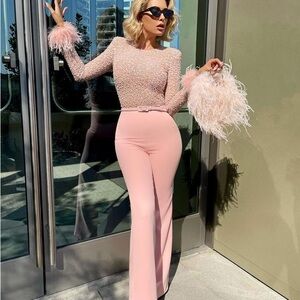 Celebrate in style with AMELIA, the ultimate jumpsuit for the risk-takers. Feather trim cuffs, intricate beading, and a detachable belt make this jumpsuit the perfect balance of bold and beautiful. So whether you're dancing all night or enjoying a day out, this fully lined crepe jumpsuit will have you looking and feeling confident.