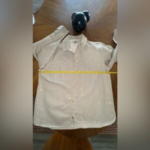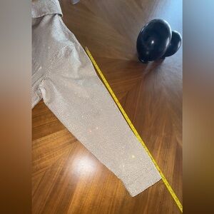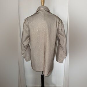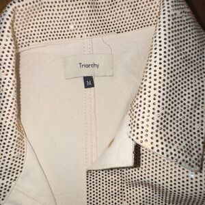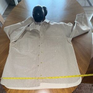TRIARCHY Ms. Cali Crystal Embellished Denim Jacket, crystal rhibestones, over-sized jacket shirt cut. VG++ condition. Rhinestones in pretty good placement, some movement in areas as expected like underarm, a minor few are darker brown. Over very good, unworn condition.