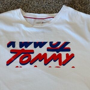 Tommy Hilfiger: women: Classic white short sleeve cotton tee with bold red and blue Tommy logo. Soft and breathable fabric. Ideal for casual outings. Classic : casual: sleepwear tee shirt. Clean: please see photos.