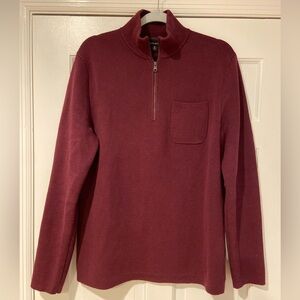 Classic and versatile Banana Republic quarter-zip sweater in a rich burgundy color. Features a warm rib knit, stand collar with metal zip closure, and a front chest pocket for added detail. A great layering piece for fall and winter.