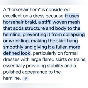 The Horse Hair Hem adds Structure to the Hemline and Body. Allows Feet to Glide in Roomy Space which Offers Glamorous and Dramatic Movement as you Walk and Dance across the floor.