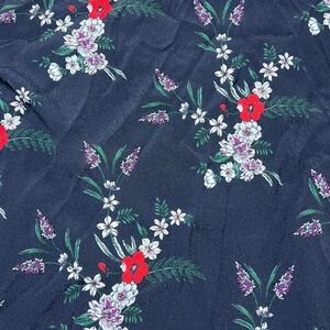 Beautiful navy blouse with delicate floral print featuring red poppies, white daisies, and purple lavender sprigs. Perfect for both office and casual wear. The romantic pattern adds a feminine touch to any outfit. Pairs wonderfully with jeans or a pencil skirt.