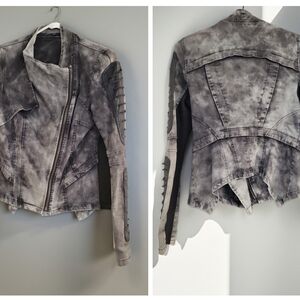 Edgy distressed design. Asymmetrical zipper. Unique panel details.