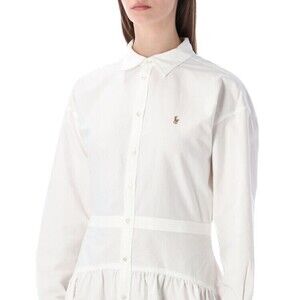 Polo Ralph Lauren presents an exquisite shirt dress crafted from smooth 100% cotton. This piece features a structured waist and a flared skirt with elegant gathered detailing, embodying a flattering silhouette suitable for both casual and refined occasions. The classic collar and button-down front are complemented by long sleeves with buttoned cuffs, while a subtle embroidered logo accentuates the chest.