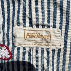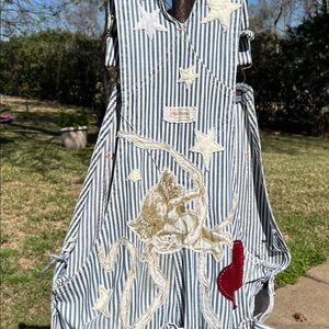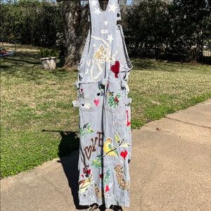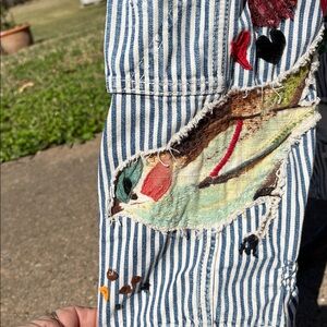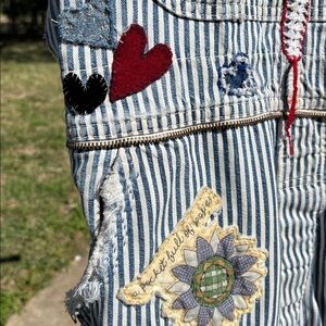 Handmade upcycled striped overalls featuring colorful embroidered patches. Inspired by Magnolia Pearl. Perfect for a casual look.
