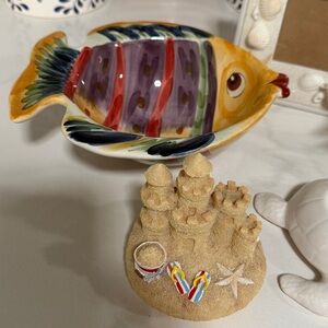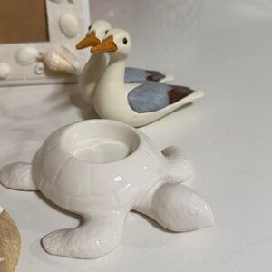 Beach theme honey decor, yankee candle sand castle beach topper, 2 wood seagulls, tea light turtle holder, shell photo frame for a photo 3”x3” and a hand made fish shape bowl. All in excellent condition.