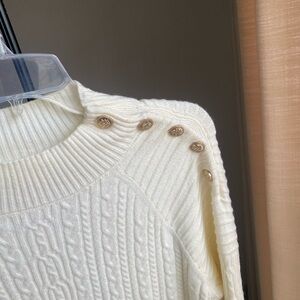 New cream sweater I would say it’s lightweight, but it still keeps the warmth in. It’s nice for layering. I like the front, but in detail on the shoulder. Soft non itching quality.