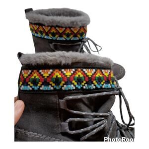 Features: Ankle length, lace up, alpine strip along the top, a nub on the back to help you pull the shoes on, faux shearling on the inside, minimal wear on the bottom.