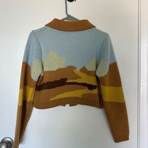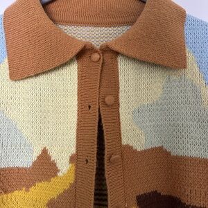 Stay stylish with this vibrant cropped sweater featuring a blend of blue, yellow, and brown hues. Perfect for adding a pop of color to your wardrobe.