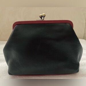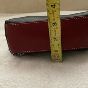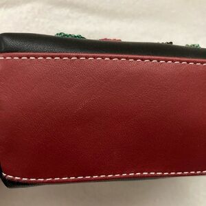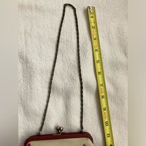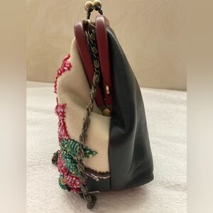 VTG NEVER USED Unique Isabella Fiore elegant clutch bag with vibrant floral embellishments. Features a striking combination of pink and green accents on a black and cream background. Kiss lock closure, zippered pocket and antique brass tone chain strap that can be used as purse or tucked inside to use as clutch. Meas. shown in pics. Perfect for adding a touch of sophistication to any outfit. Great addition to your purse collection. See all pictures as they are part of the description.