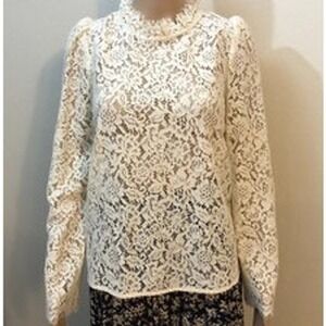Floral lace blouse in a creamy off-white hue features a sophisticated high mock neck with delicate eyelash fringe trim. Long sleeves are designed with slight puff shoulders for a structured yet feminine silhouette. The intricate all-over lace pattern provides a romantic, vintage-inspired look, while the back keyhole with a single button closure ensures a polished finish.