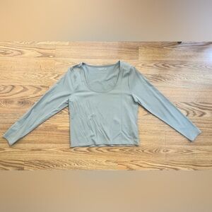 Chic long sleeve top with a scoop neck. Soft fabric for everyday wear. Ideal for layering or standalone style. Body hugging fit. Slight piling under the arms and small snag on the body. Not noticeable when wearing. Really cute top! Size XL