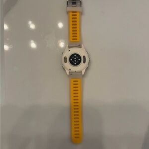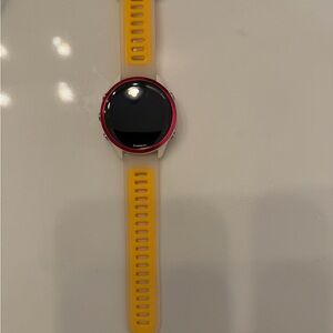 Garmin Forerunner 570 with a striking yellow band. Advanced GPS and smart features.