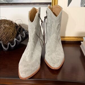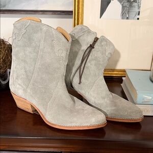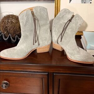 Stylish light gray suede booties with a Western flair. Features a side zipper and wooden heel.
