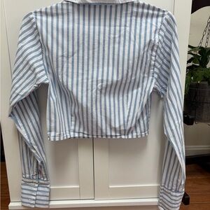 Chic button-down with light blue and white stripes. Features long sleeves and a classic collar.