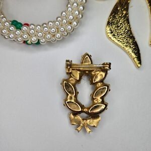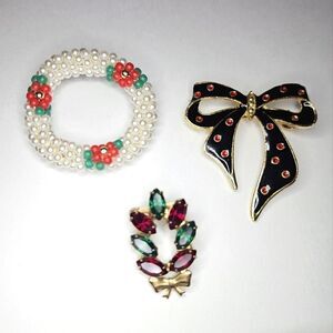 This is a lovely set of vintage Christmas brooches. The first is a lovely seed beaded faux pearl wreath with little red beaded flowers. The second is an enameled black and red bow with small rhinestones and a gold tone backing. The last is a lovely vintage red and green marquis cut rhinestone wreath with a little gold tone bow. All three are in great vintage condition and ready for the holidays! The wreath and the bow measure approximately 2" wide and the rhinestone brooch measures 1.25" tall.