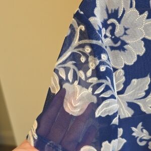 Elegant women's top featuring a beautiful blue and white floral design with see-through sleeve details. Perfect for any occasion.