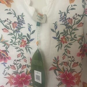 Elegant white linen dress featuring vibrant floral embroidery. Perfect for any occasion.