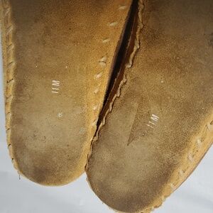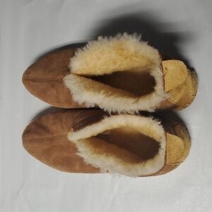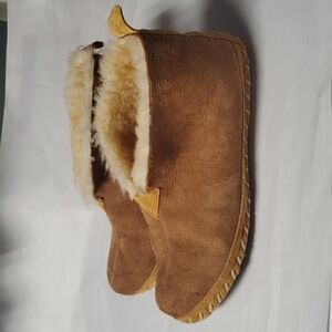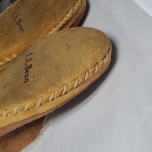 Mens L.L.Bean slippers lined with shearling. Stitch details. These are pre-owned but still have alot of life left. The bottoms are a bit dirty but otherwise good. Warm and cozy. Winter. Cabin. Western. Equestrian. Preppy.
