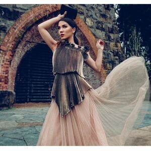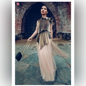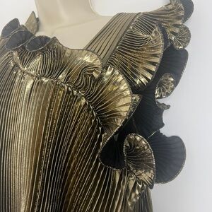 Features a pleated metallic gold and black lame fabric with an asymmetrical, high-low hemline and a 3D ruffled neckline