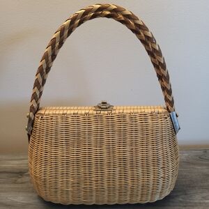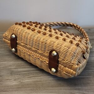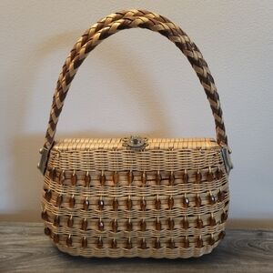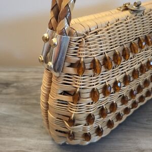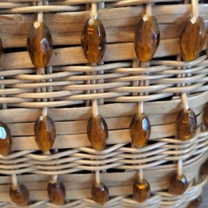 Circa mid century. Natural color woven wicker handbag has protective plastic coating, amber brown beads on 1 side, dual top handles with two tone weaving, turn lock closure, metal hardware, and 4 metal feet with leather details. Brown fabric lining with interior zip pocket. Overall great condition. Minor signs of wear on exterior, but interior lining has some fraying & tiny holes. Measures approx 11.5" wide x 8" tall. Straps provide 7" drop.