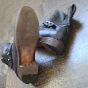 Sleek black leather combat boots. Rugged design with sturdy soles. Ideal for versatile styling.