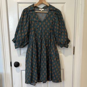 Entro Blue and Orange Floral Puffy Sleeve Boho Cottagecore Dress M