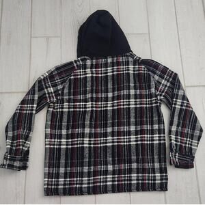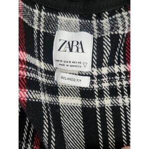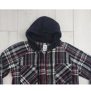 Zara Mens Medium Plaid Overshirt Shacket Button Up Hooded Jacket Black Red Shirt