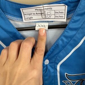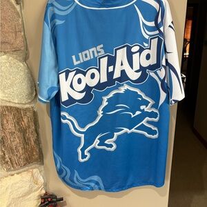 The product is a Men's 2XL Blue and White Detroit Lions Button Front Baseball Jersey, officially licensed by the National Football League (NFL). This short-sleeve jersey features the team's logo and colors, perfect for showing support during the regular season. Made for football fans, this jersey is a great addition to any sports memorabilia collection.