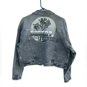 WILD FABLE women’s black denim oversized jacket size M with costume design desert vibes fabric pic sewed 🌵 (by me 😉) USED in like new condition