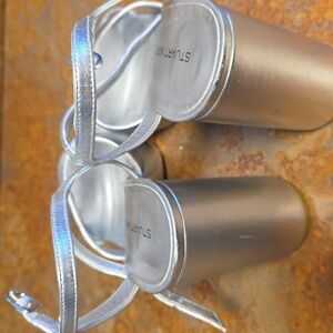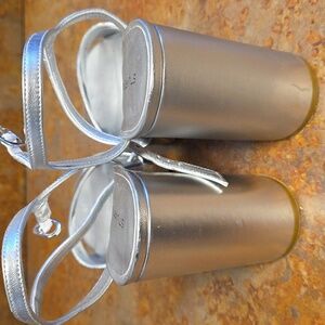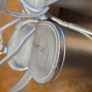 Shimmer in these metallic silver heels by Stuart Weitzman. Sleek design with a chic finish. Ships in original box. No dustbag. Worn once. Minor wear as pictured.