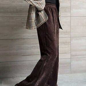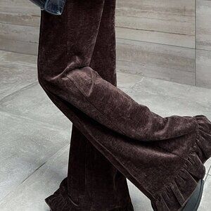 Coffee Brown Women's Elastic Waist Velvetish ruffled Hem Long Pants