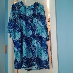 Here we have a size 4X, blue; tropical print bathing suit. The top has a blue and white floral graphic and the shorts; solid navy blue. The cut is modest and mature.