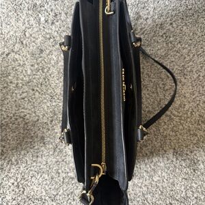 In perfect condition, has one small stain on the zipper, pictured. A large black purse and has a strap as well. Many pockets inside and is very spacious, perfect to put a laptop or other essentials.