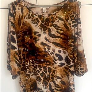 🇺🇸Animal Print Cold Shoulder Blouse with Gold Accents Slit Sleeves Made In USA