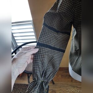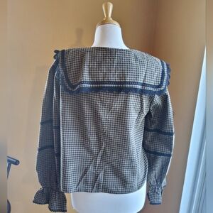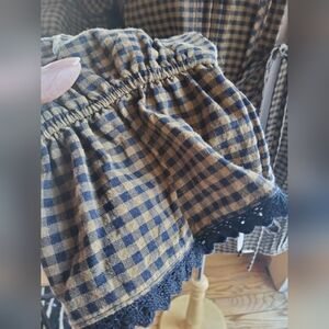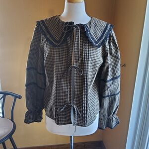Charming gingham blouse featuring a brown and black checkered pattern. Adorned with lace trim and bow details. Stock picture is a different blouse but gives you an idea of styling. Sized medium, but easily fits a large.