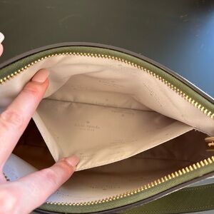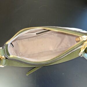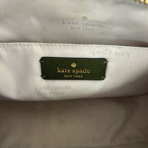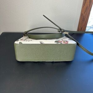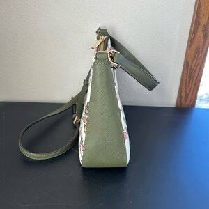 Chic floral design with pink accents. White base with green strap. Has a few very faint marks on the front shown in pictures, light wear on hardware along with some light marks on inside. Overall in great used condition with tons of use left! Perfect for any outing!