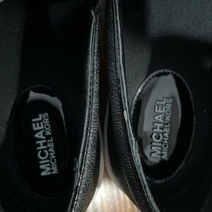 Elegant black leather loafers. Features silver MK logo. Comfortable and stylish.