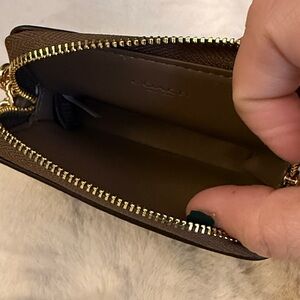Elegant Coach card holder in tan. Features a chic gold chain. Ideal for card organization.