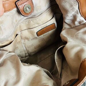 Chic Michael Kors shoulder bag in tan leather. Features gold chain accents. Ideal for versatile styling. The handles are more used like it seems in the picture