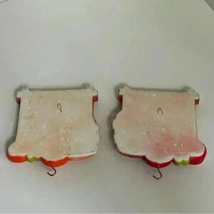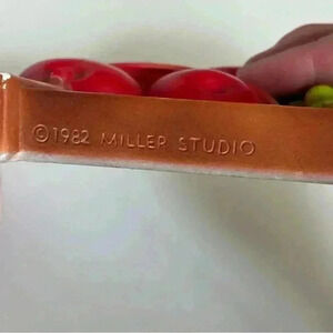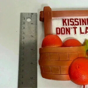Set of 2 1982 Miller Studio chalkware decorative kitchen wall plaques. “Kissing don’t last” and “Cookery Do” (meant to be read in that order.) Featuring delightful bright fruit baskets with oranges and apples, hooks to hang potholders, dish towels, etc, and wire on the back to hang on the wall. In very good preowned condition with no cracks. There are some small chips around the edges (see pics) but the paint is mainly intact and still vibrant.