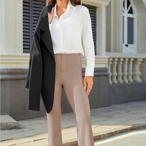 Step out in style with these elegant tan boot cut pants. Featuring a faux fly design and convenient back side pockets, they offer both sophistication and practicality.